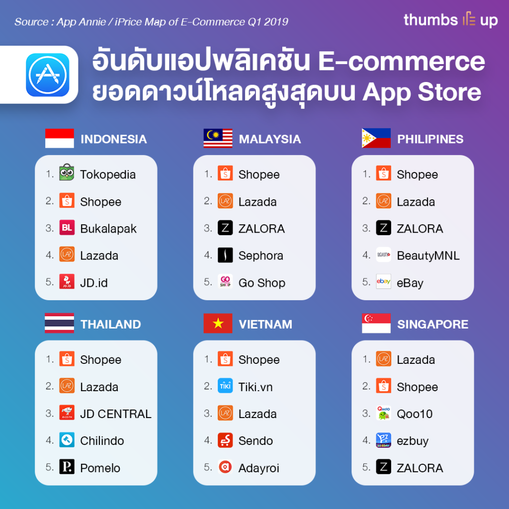 ซึ่งในไตรมาสนี้ หากดูที่ยอดบน App Store จะพบว่า Shopee ครองอันดับ 1 ใน 5 ประเทศ (ได้แก่ อินโดนีเซีย, มาเลเซีย, ฟิลิปปินส์, ไทย และเวียดนาม) ในขณะที่ Lazada ได้อันดับที่ 1 จากตลาดสิงคโปร์เท่านั้น