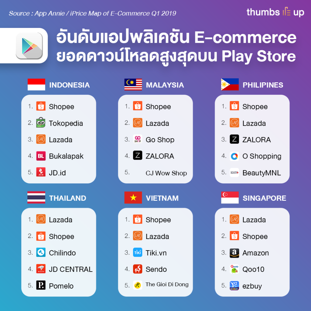ส่วนบน Play Store ร้าน Shopee ยังได้ครองอันดับหนึ่ง ถึง 4 ประเทศ (ได้แก่ อินโดนีเซีย, มาเลเซีย, ฟิลิปปินส์ และเวียดนาม) แต่ Lazada ได้ส่วนแบ่งอันดับหนึ่ง แค่เพียง 2 ประเทศ (ได้แก่ ไทยและสิงคโปร์) เท่านั้น