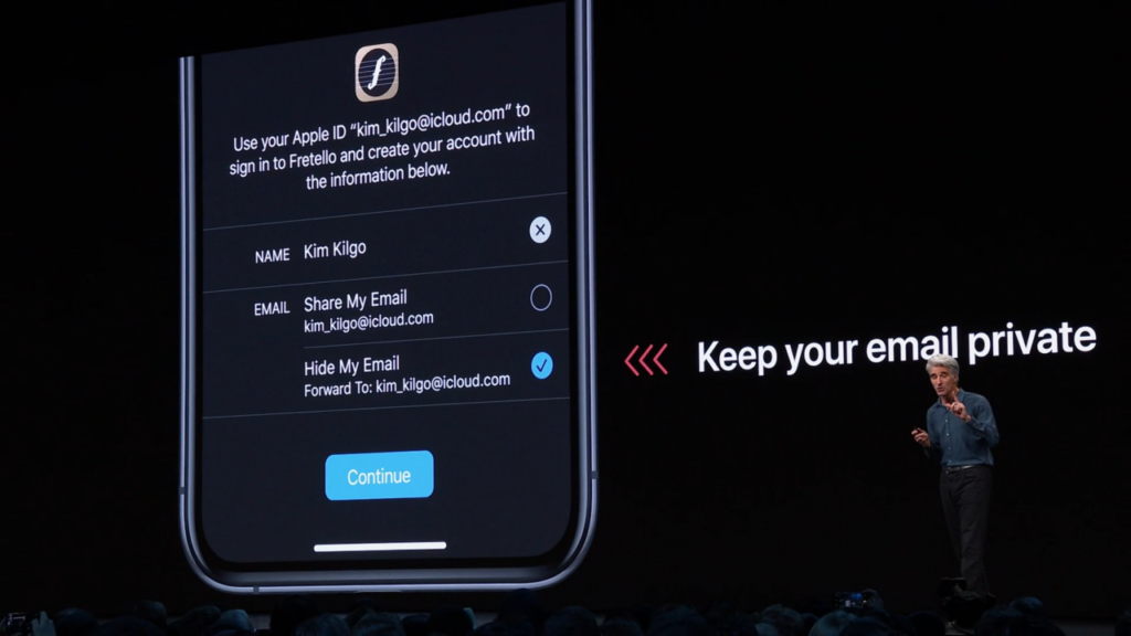 วิธีแก้ของ Apple คือการเปิดให้เลือกอีเมลที่จะให้แอปอื่นๆ ใช้ได้ และมีตัวเลือกให้ส่งอีเมลแบบนิรนามที่มีการเข้ารหัสได้ ตัวอย่างอีเมล เช่น fc452bd5ea@privaterelay.appleid.com เป็นต้น ซึ่งอีเมลแบบนิรนามที่ปรากฎในแอปอื่น ก็จะมีชื่ออีเมลที่แตกต่างกันออกไปในแต่ละแอปอีกด้วย