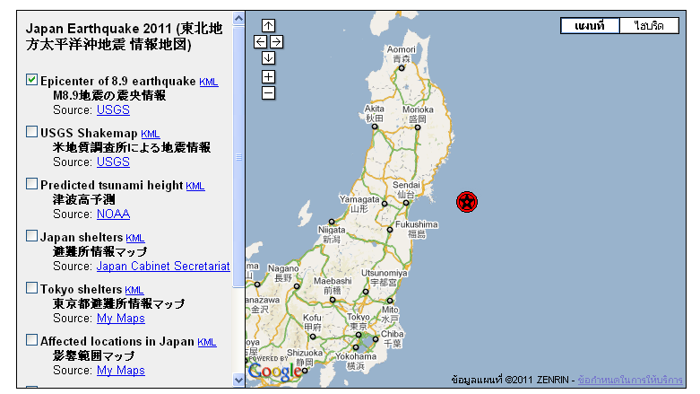 มีการดึง Feed มาจาก Twitter สำหรับข้อมูล Realtime updates (แม้ว่าทุกวันนี้ Google จะค้นหาข้อมูลที่ Tweet ออกมาได้และเชื่อมต่อกับ Buzz แล้วก็ตาม แต่ก็จะไม่ค่อยพบเห็น Google นำมาใช้กับบริการอื่นๆ ของตัวเองบ่อยนัก แปลว่าส่วนหนึ่งต้องยอมรับว่าข้อมูลที่มาจาก User-Generated Content ถ้ารวดเร็ว ฉับไวยังไงควรมาจาก Twitter) ?โดยจะ monitor คำที่สำคัญๆ เอาไว้อย่างกรณีของญี่ปุ่นเช่น Earthquake, Tsunami หรือ อักษรท้องถิ่นอย่าง ?? ( ??? ) jishin แผ่นดินไหว นั่นเอง