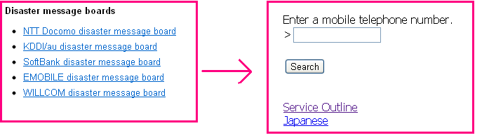 นอกจากนี้ยังมีการจับมือกับผู้ให้บริการโทรศัพท์มือถือทั้ง Docomo, KDDI, SoftBank, EMOBILE, WILLCOM เพื่อให้ผู้ที่ใช้บริการของค่ายต่างๆ สามารถส่งข้อมูลขึ้นมาอัพเดตให้คนอื่นๆ ได้ทราบว่าตนยังปลอดภัยอยู่หรือไม่ด้วยบริการที่ชื่อ “Disaster Message Boards” เพีียงใส่เลขหมายของคนที่เราเป็นห่วง ระบบก็จะทำการสืบค้นว่ามีข้อความของคนคนนั้นทิ้งเอาไว้หรือไม่ อย่างไรก็ตามนั่นหมายถึงเค้าก็ต้องทำการสมัครเปิดบริการนี้ไว้ด้วยถึงจะแจ้งอัพเดตข้อมูลตนเองได้เช่นกัน