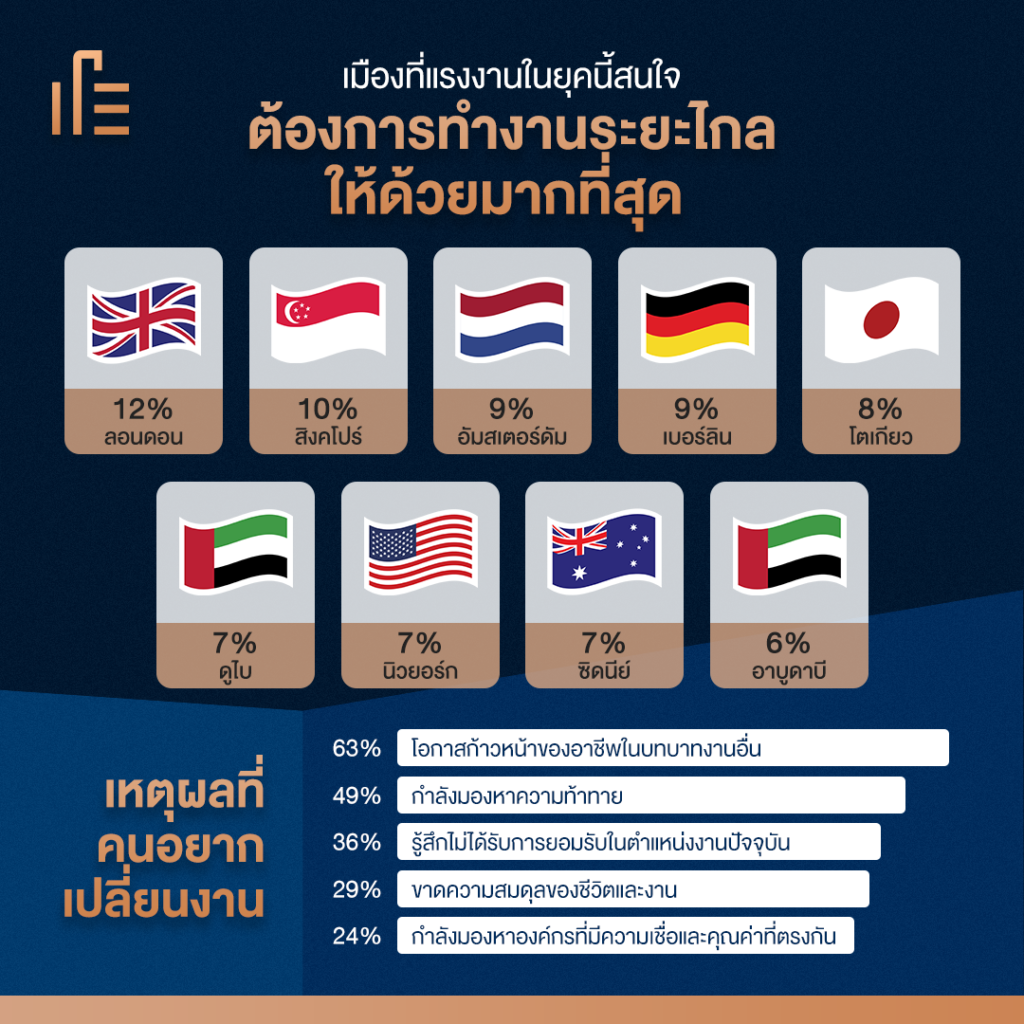 แรงงานที่มีทักษะดิจิทัลมีความกระตือรือร้นที่จะเปลี่ยนงานภายใต้สายงานเดิม โดยมีปัจจัยด้านความต้องการแสวงหาโอกาสในการก้าวหน้าอัตราค่าตอบแทนที่สูงขึ้น และความท้าทายใหม่ ๆ เป็นแรงจูงใจหลัก นอกจากนี้ แรงงานยุคดิจิทัลจำนวนไม่น้อยตระหนักถึงความสะดวกสบายจากการทำงานระยะไกลในช่วงวิกฤตโรคระบาด โดยเกือบ 70% ของคนทำงานทั่วโลกยินดีที่จะทำงานแบบระยะไกลให้กับองค์กรที่อยู่ต่างพื้นที่