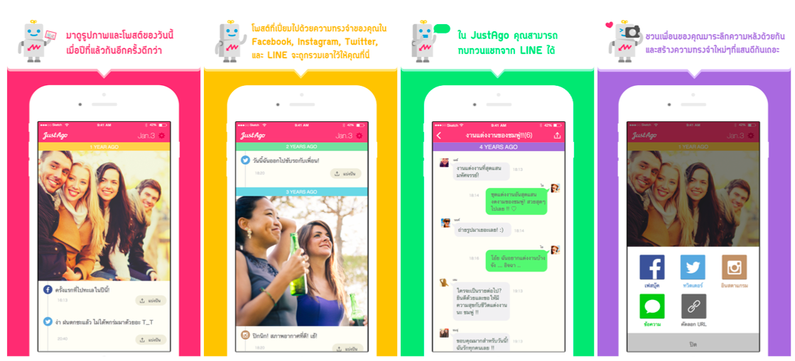 JustAgo พัฒนาโดยบริษัทยักษ์ใหญ่อย่าง DeNA ญี่ปุ่น เตรียมจะรุกตลาดไทยเร็วๆ นี้ ว่าแต่ต่างกับ Timehop อย่างไร? JustAgo เห็นว่าตลาดในบ้านเรา LINE ได้รับความนิยมอย่างสูงเฉกเช่นเดียวกับญี่ปุ่น จึงไม่น่าแปลกใจนักที่ JustAgo จะมองตลาดไทยเป็นตลาดใหญ่ที่น่าเข้ามาเปิดตัว โดยสามารถเชื่อมต่อกับ LINE และดึงเอาข้อความเก่าๆ ในนั้นมาแสดงได้