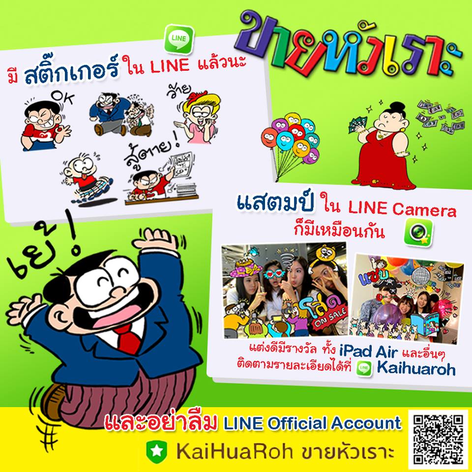 สติ๊กเกอร์ของขายหัวเราะมีอยู่ทั้งหมด 40 แบบ จำหน่ายในราคา 0.99 เหรียญ หรือ 30 บาท เปิดตัวมาพร้อมกับ LINE Official Account แต่สิ่งที่น่าสนใจในข่าวนี้กลับไม่ใช่เรื่องขายหัวเราะมาอยู่บน LINE แต่เป็นประเด็นที่ว่าคนไทยให้การตอบรับค่อนข้างมาก ถึงขนาดที่ว่าใครที่ไม่เคยซื้อสติ๊กเกอร์บน LINE มาก่อนก็ต้องหันมาซื้อกันเลยทีเดียว สิ่งที่ดึงดูดให้คนดาวน์โหลดน่าจะเป็นเพราะเราต่างก็เติบโตมากับคาแรกเตอร์แบบไทยๆ เหล่านี้นั่นเอง
