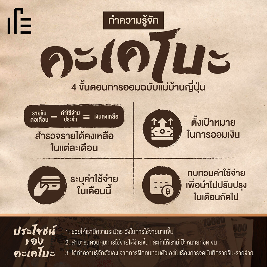 วิธีการบริหารเงินแบบแม่บ้านญี่ปุ่นนั้นเรียกว่า คะเคโบะ (Kakeibo 家計簿) แปลว่า สมุดบัญชีครัวเรือน เป็นวิธีการจัดการเรื่องเงินที่มีมายาวนานกว่า 100 ปี เคล็ดลับของ คะเคโบะ คือ การจดบันทึกรายรับรายจ่าย ‘อย่างจริงใจ’ ในแต่ละเดือน เพื่อที่จะนำไปปรับปรุงให้ดีขึ้นในเดือนต่อๆไป