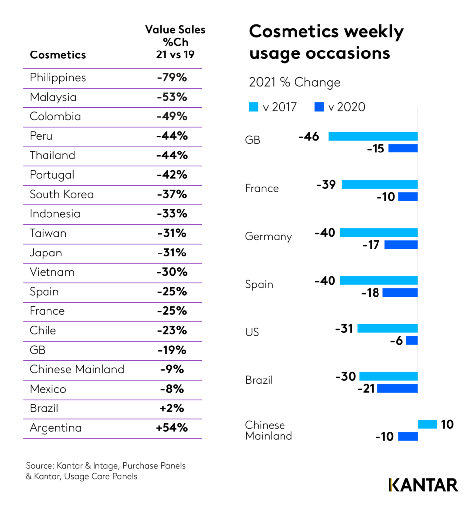 ทั้งนี้ Kantar เผยผลวิจัยที่แสดงให้เห็นว่าการล็อกดาวน์จากโควิดและการเปลี่ยนแปลงวัฒนธรรมการทำงานจากที่บ้าน ได้สร้างการเปลี่ยนแปลงตลาดความงามทั่วโลก แสดงให้เห็นว่าการใช้เครื่องสำอางต่อสัปดาห์ในทุกตลาดลดลงอย่างเห็นได้ชัด โดยลดลงโดยเฉลี่ย 28% เทียบกับก่อนเกิดโรคระบาด และลดลง 31% เมื่อเทียบกับเมื่อ 5 ปีที่แล้ว เนื่องจากผู้หญิงเลือกกิจวัตรที่ง่ายขึ้น ลดขั้นตอนลงการแต่งหน้าลง แต่มีคุณภาพสูงขึ้น ทำให้การใช้ผลิตภัณฑ์ความงามระดับพรีเมียมเพิ่มขึ้น รวมทั้งต้องการผลิตภัณฑ์ความงามจากธรรมชาติสูงขึ้น จากยอดขายโดยเฉลี่ย 18% ในปี 2017 เป็น 24% ของยอดขายในปี 2021 ช่วยให้ตลาดฟื้นตัวสู่ระดับก่อนเกิดโรคระบาด