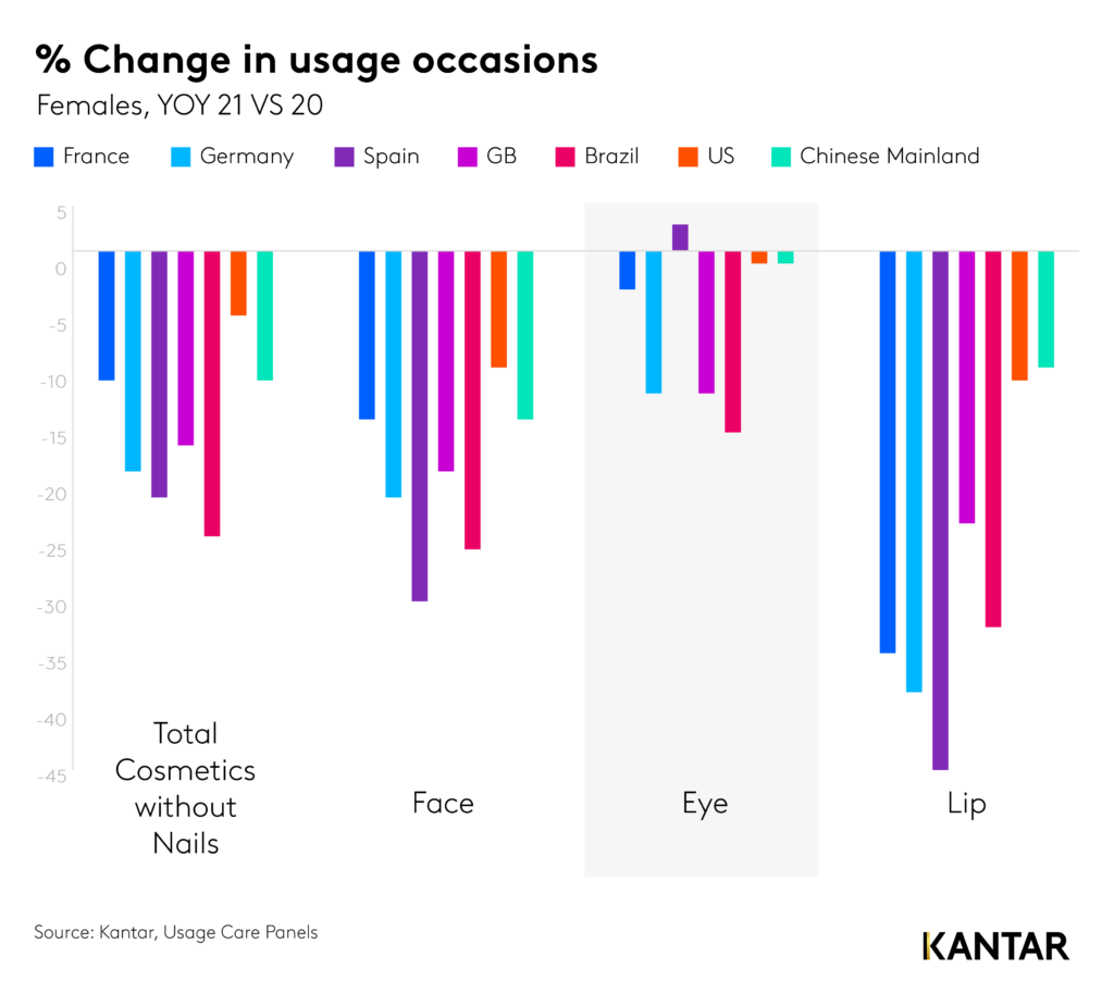 นอกจากนี้ ผลวิจัยยังแสดงให้เห็นถึงแนวโน้มทั่วโลกที่มีต่อโอกาสการใช้งานเครื่องสำอางค์ที่ลดลง โดยเฉพาะอย่างยิ่งในหมู่ผู้บริโภคในยุโรป การใช้งานผลิตภัณฑ์สำหรับใบหน้าและริมฝีปากลดลงอย่างมีนัยสำคัญหากเทียบกับปีก่อนหน้า โดยเน้นที่การแต่งหน้าส่วนของดวงตามากขึ้น ซึ่งอาจเป็นผลมาจากการสวมหน้ากากระหว่างการระบาดใหญ่