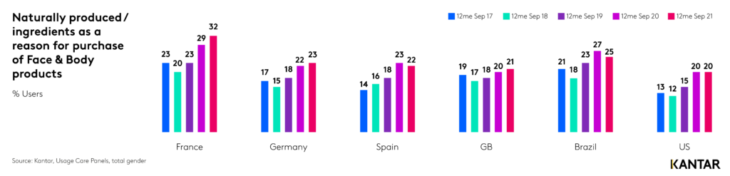 - ผู้บริโภคซื้อผลิตภัณฑ์สำหรับผิวหน้าและผิวกายที่มีส่วนผสมตามธรรมชาติเติบโตโดยเฉลี่ย 18% ของยอดขายในปี 2017 เป็น 24% ของยอดขายในปี 2021 การเพิ่มขึ้นที่ใหญ่ที่สุดคือฝรั่งเศส โดยที่การเปลี่ยนแปลงมาจากผู้บริโภค 23% ในปี 2019 เป็น 32% ในปี 2021