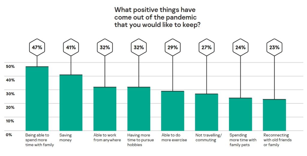 การวิจัยยังได้เน้นว่า เกือบหนึ่งในสาม (32%) ของพนักงานเห็นการทำงานแบบรีโมทเข้ามาเป็นเหมือนสวัสดิการชั้นเยี่ยมที่เป็นผลพลอยได้จากโคโรนาไวรัสจัดสรรให้เลยทีเดียว ติดอันดับสาม ตามข้อดีจากการได้มีเวลากับครอบครัวมากขึ้น (47%) และประหยัดเงินได้มากโข (41%) อันที่จริง ข้อได้เปรียบที่เด่นชัดนั้นเกี่ยวข้องกับการได้โอกาสดูแลความสนใจส่วนตัวที่นอกเหนือไปจากเรื่องงาน เพราะการมีสมดุลระหว่าง งาน-ชีวิตส่วนตัว คือ สิ่งจำเป็นของชีวิต