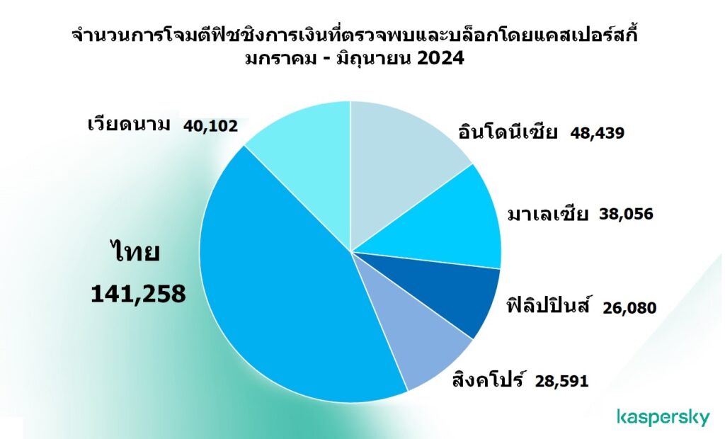 สำหรับประเทศไทยพบจำนวนการโจมตีด้วยฟิชชิงทางการเงินสูงสุดในภูมิภาคมากถึง 141,258 ครั้ง รองลงมาคืออินโดนีเซีย 48,439 ครั้ง เวียดนาม 40,102 ครั้ง มาเลเซีย 38,056 ครั้ง สิงคโปร์ 28,591 ครั้ง และฟิลิปปินส์น้อยที่สุด 26,080 ครั้ง ทั้งนี้ ประเทศไทยและสิงคโปร์มีจำนวนการโจมตีด้วยฟิชชิงเพิ่มขึ้นสูงสุด 582% และ 406% ตามลำดับ เมื่อเทียบกับช่วงครึ่งปีแรกของปีที่แล้ว