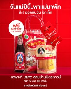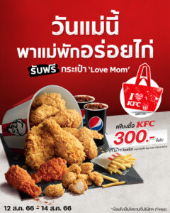 และ KFC ยังมี โปรโมชัน พิเศษเนื่องในวันแม่ เมื่อพาแม่ไปอิ่มอร่อยกับไก่ทอดที่ KFC เพียงซื้อไก่ทอด 300.- ขึ้นไป จะได้รับกระเป๋า ‘Love Mom’ เป็นของแถม ตั้งแต่วันที่ 12-14 ส.ค. 2566 และพิเศษ สำหรับวันแม่ที่ 12 ส.ค. นี้ เมื่อพาแม่ไปรับประทานไก่ทอด ที่ KFC สาขา สามย่านมิตรทาวน์สำหรับ 200 สิทธ์แรก รับฟรี Let Mom Rest Gift Set.