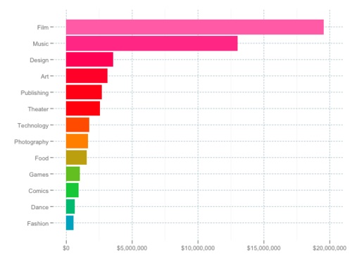 คงจะเห็นจากชาร์ตด้านบนแล้วนะครับว่าหมวดภาพยนตร์มีคนได้เงินไปมากที่สุด นั่นคือ? 19,717,790 เหรียญภายใน 2 ปี และหมวดขายดีถัดมาก็คือหมวดดนตรีที่มีคนออกทุนให้นักดนตรีไปทำอัลบั้มคือ 13,094,547 เหรียญ ได้เงินมากเสียจนตอนนี้เริ่มมีค่ายเพลงเอาแบบบ้างแล้ว
