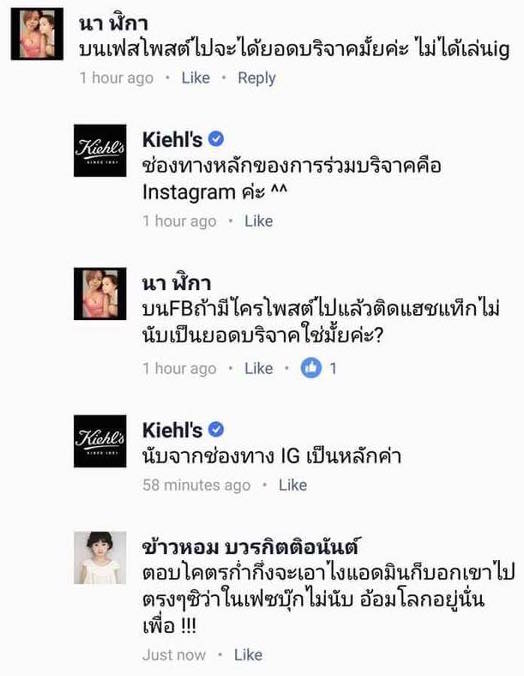 เมื่อสงสัย ชาวออนไลน์หลายคนเข้ามาถามที่เพจของ Kiehl’s บน Facebook โดยตรง แต่ปรากฏว่าแอดมินเพจตอบด้วยข้อความซ้ำเดิมเพียงว่า “นับเฉพาะบน Instagram เท่านั้นค่ะ” แทนที่จะบอกให้ชัดไปเลยว่า “บน Facebook ไม่นับค่ะ”