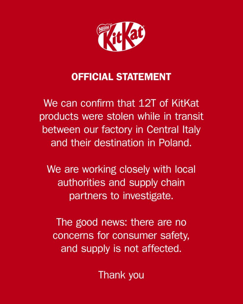 เมื่อสโลแกนสุดฮิตถูกโจรตีความผิด! เกิดเหตุโจรกรรม KitKat ครั้งใหญ่ในยุโรป หายไปกว่า 12 ตัน (4 แสนกว่าชิ้น) ระหว่างขนส่งจากอิตาลีไปโปแลนด์ ทำเอา Nestle ต้องรีบงัดระบบ Batch Code มาไล่ล่าตามหาของกลางในตลาดมืด