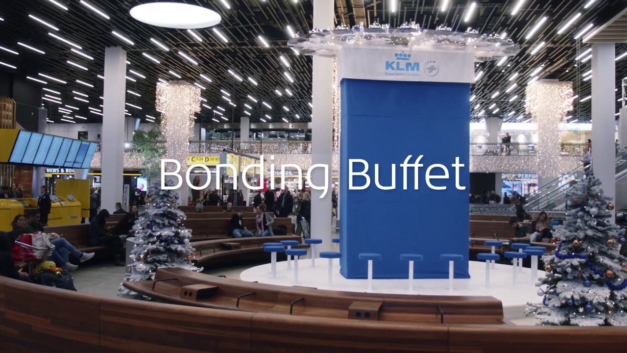 Bonding Christmas Buffet คือโต๊ะพิเศษที่ทาง KLM เนรมิตรขึ้นมาที่สนามบินอัมสเตอร์ดัม ประกอบไปด้วยโต๊ะและเก้าอี้ แต่พิเศษนิดหน่อยตรงที่โต๊ะจะอยู่สูงจากพื้นปกติ การที่จะทำให้โต๊ะลดระดับลงมาก็ต้องนั่งที่เก้าอี้ที่เรียงรายรอบวง กิจกรรมนี้จำเป็นต้องชวนคนที่อยู่รอบข้างที่เราอาจจะไม่รู้จักมาก่อน มาช่วยร่วมวงกับเรา เพื่อให้โต๊ะที่เต็มไปด้วยอาหารลดระดับลงมา และจะทำให้ทุกคนได้ทานอาหารกัน