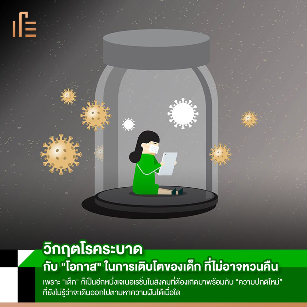 วิกฤตโรคระบาด กับ “โอกาส” ในการเติบโตของเด็ก ที่ไม่อาจหวนคืน เพราะไม่ใช่แค่ธุรกิจที่ต้องปิดตัวลงจากภาวะการแพร่ระบาด หรือต้องสูญเสียคนในครอบครัวไปอย่างไม่มีวันกลับ แต่ “เด็ก” ก็เป็นอีกหนึ่งเจเนอเรชั่นในสังคม ที่ต้องเกิดมาพร้อมกับ ความปกติใหม่ที่บางคนต้องใช้ชีวิตกับ “หน้ากาก” ไปแบบไม่รู้วันจบ รวมทั้งโลกแห่งการออกไปแสวงหาและเรียนรู้ก็กลายมาเป็นกรอบที่อยู่แค่หน้าจอเพื่อการศึกษา