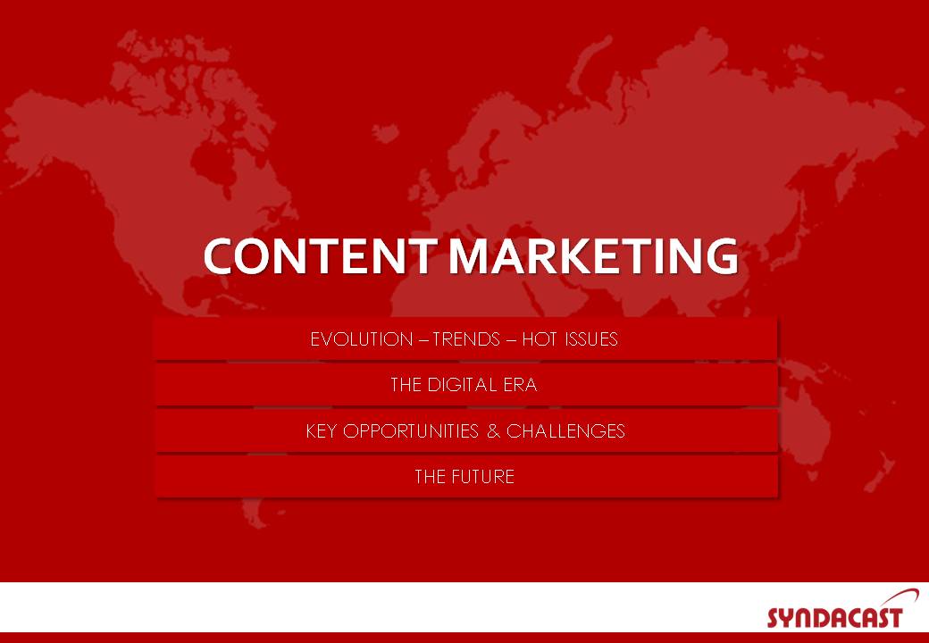 การพัฒนายังมีมาอย่างต่อเนื่อง จนกระทั่งปี 1998 ได้มีการจัดตั้ง Customer Publishing Council ขึ้น และกลายมาเป็นแหล่งข้อมูลที่สำคัญสำหรับการทำการตลาดด้วยคอนเทนต์ก่อนที่จะข้ามมาถึงปี 2011 ที่กระแส Content Marketing เริ่มเป็นที่รู้จักอย่างกว้างขวางและมีหนังสือเฉพาะทางวางขายอยู่ทั่วไป