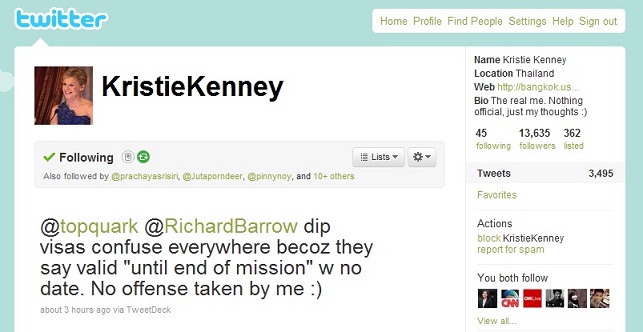 ทวีตล่าสุดของ Twitter ท่านทูตได้บอกว่า วีซ่าการทูตของท่านทำให้เจ้าหน้าที่ตรวจคนเข้าเมืองสับสน ต้องอธิบายกันอยู่นาน เนื่องจากวีซ่าไม่ระบุระยะเวลาที่ได้รับอนุญาตให้อยู่ในประเทศไทย แต่ท่านทูตก็บอกว่า ชินซะแล้ว เนื่องจากทำให้เจ้าหน้าที่ในหลายๆประเทศงงอยู่บ่อยๆ 🙂