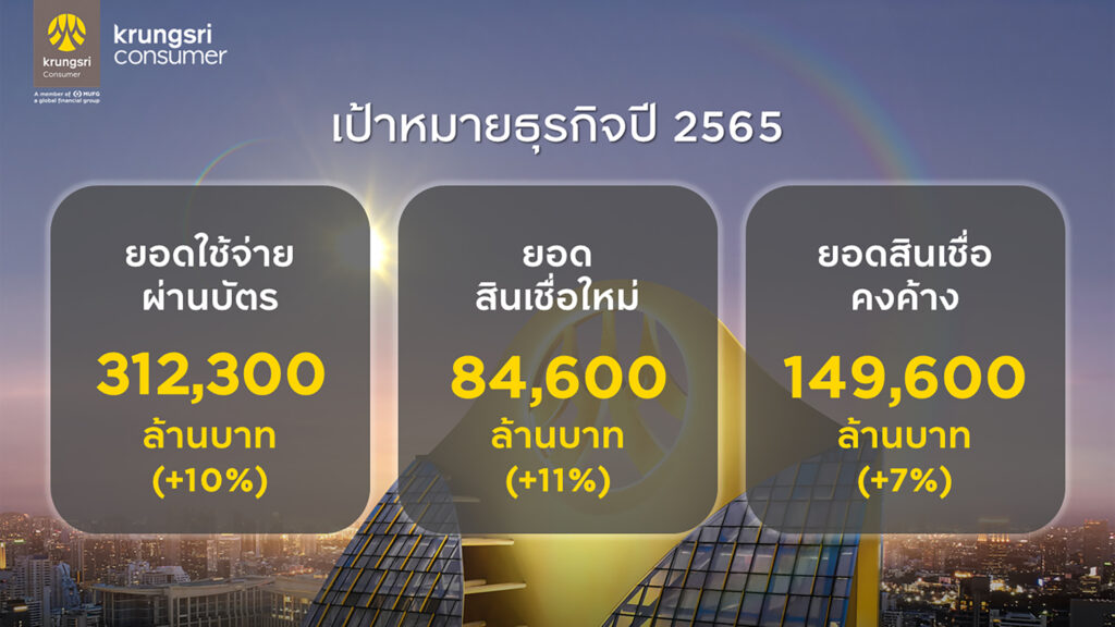 “กลยุทธ์ทั้งสามประการนี้ เป็นไปเพื่อเสริมศักยภาพของกรุงศรี คอนซูมเมอร์ ให้สอดรับกับสภาวะแวดล้อมในการดำเนินธุรกิจในโลกยุคใหม่ รวมถึงความต้องการของผู้บริโภคที่เปลี่ยนไป เพื่อรักษาความเป็นผู้นำในธุรกิจการเงินไว้ได้อย่างต่อเนื่อง ทั้งนี้ ในปี 2565 กรุงศรี คอนซูมเมอร์ ตั้งเป้ายอดใช้จ่ายผ่านบัตร 312,300 ล้านบาท ยอดสินเชื่อใหม่ 84,600 ล้านบาท และยอดสินเชื่อคงค้าง 149,600 ล้านบาท”