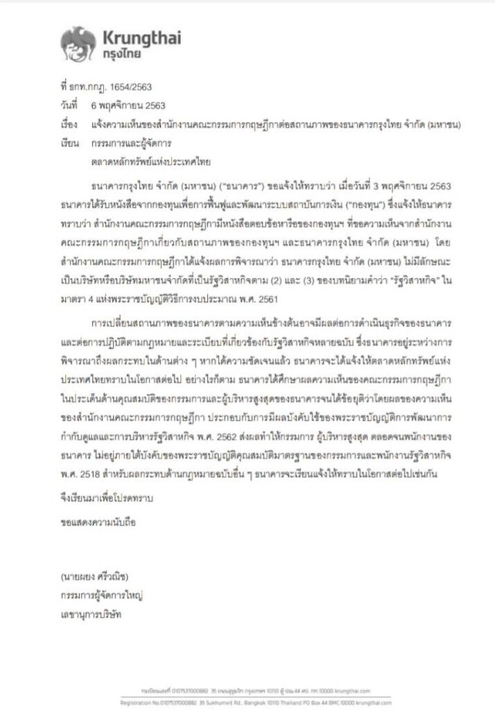 ผยง ศรีวณิช กรรมการผู้จัดการใหญ่ ธนาคารกรุงไทย เเจ้งต่อ ตลาดหลักทรัพย์แห่งประเทศไทย เรื่อง “แจ้งความเห็นของสำนักงานคณะกรรมการกฤษฎีกาต่อสถานภาพของธนาคารกรุงไทย จำกัด (มหาชน)”