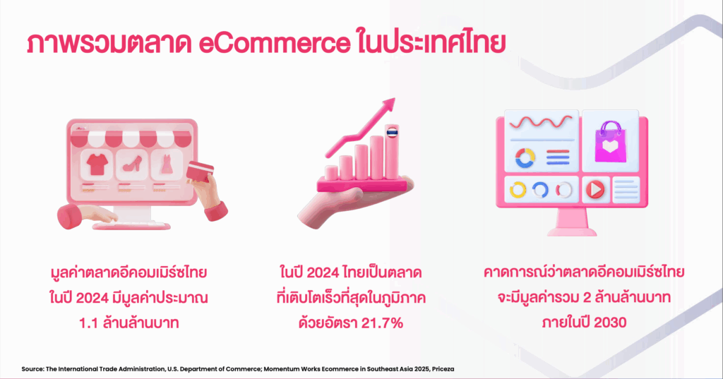 - ตลาดอีคอมเมิร์ซไทยโตสวนกระแส ท่ามกลางความท้าทายทางเศรษฐกิจ ตลาดอีคอมเมิร์ซไทยกลับเติบโตอย่างแข็งแกร่งถึง 21.7% ในปี 2567 ซึ่งสูงกว่าค่าเฉลี่ยของภูมิภาค (12%) และคาดว่าจะทะยานแตะ 2 ล้านล้านบาทภายในปี 2573