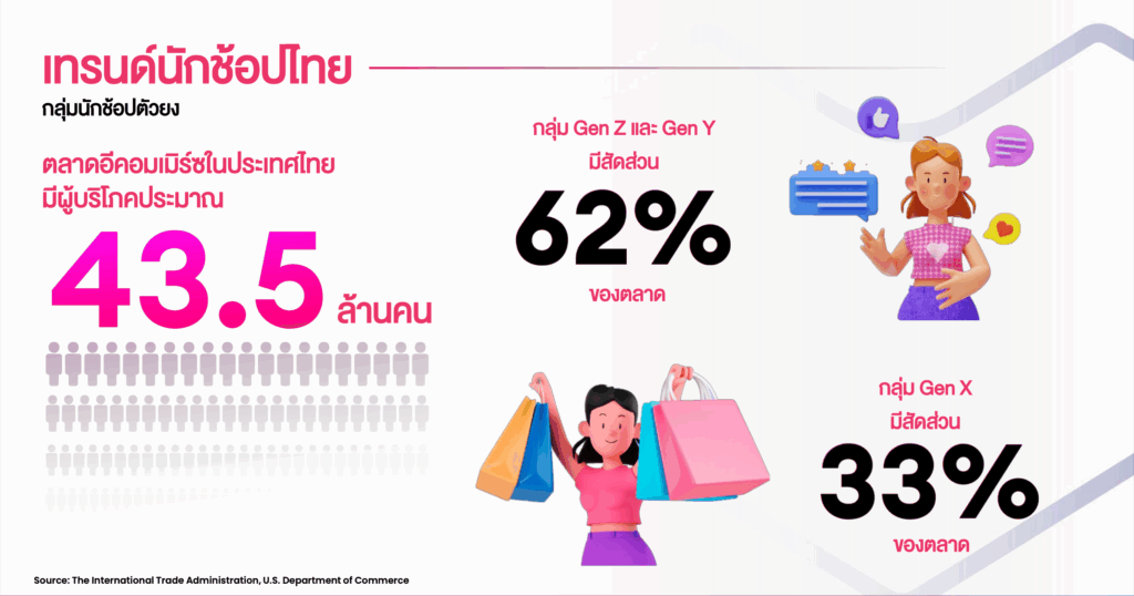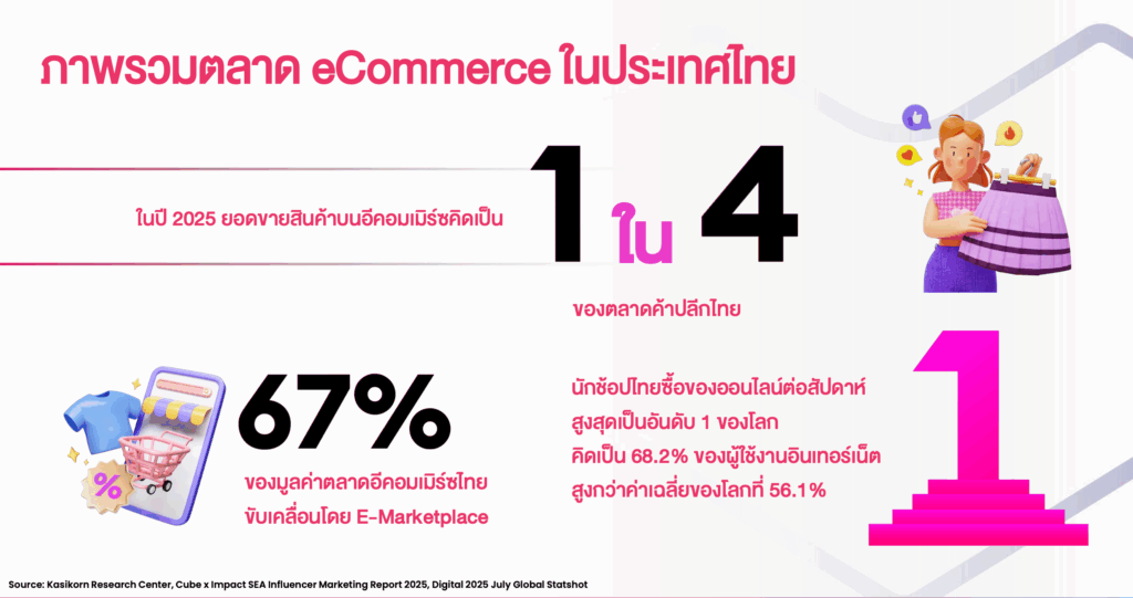 - พฤติกรรมผู้บริโภคที่เปลี่ยนไป นักช้อปไทยครองแชมป์การซื้อของออนไลน์ต่อสัปดาห์สูงสุดในโลก (68.2% ของผู้ใช้อินเทอร์เน็ต) แต่พฤติกรรมของพวกเขาเปลี่ยนไปอย่างมีนัยสำคัญ ผู้บริโภคยุคใหม่ไม่ได้มองแค่ราคาที่ถูกที่สุด แต่พิจารณาอย่างรอบคอบถึง “ความคุ้มค่า” ซึ่งหมายรวมถึงคุณภาพของสินค้า, ความน่าเชื่อถือของแบรนด์, และประสบการณ์การช้อปปิ้งที่ราบรื่น
