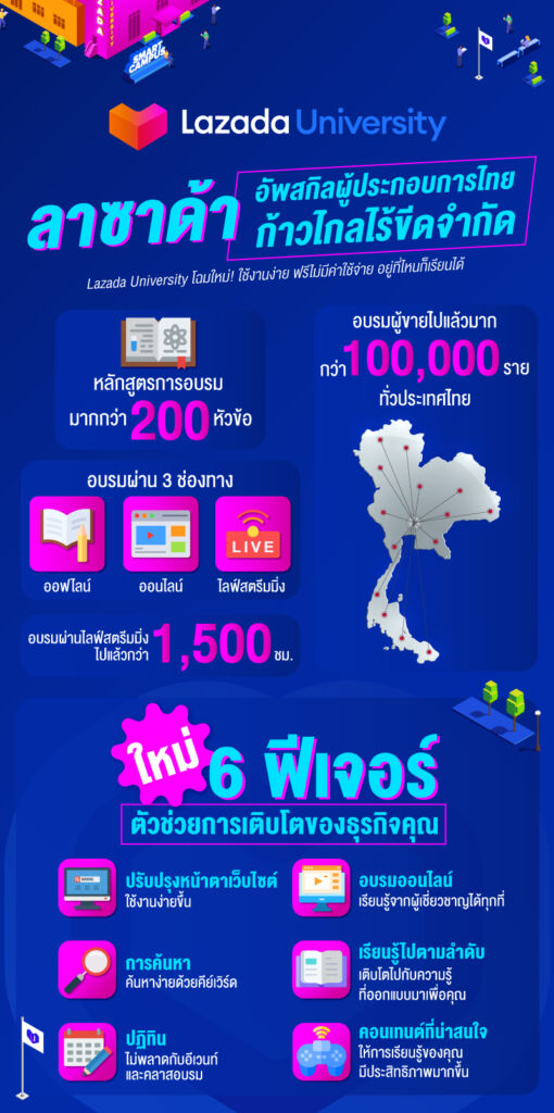 ลาซาด้า ประเทศไทย เริ่มต้นเปิดตัว Lazada University มาตั้งแต่ปี 2559 อบรมผู้ขายไปแล้วกว่า 100,000 ราย หลักสูตรการอบรมมากกว่า 200 หัวข้อ มีการจัดอบรมแบบไลฟ์สตรีมสำหรับผู้ขายไปแล้วกว่า 1,500 ชั่วโมง และมีผู้ขายที่ได้รับการรับรองจากลาซาด้าให้เป็นเทรนเนอร์อย่างเป็นทางการไปแล้ว 6 คน