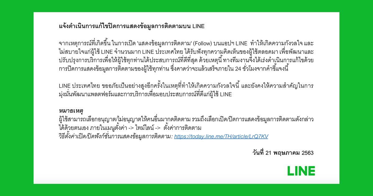LINE ประเทศไทยได้รับฟังทุกความคิดเห็นของผู้ใช้ตลอดมา เพื่อพัฒนาและปรับปรุงการบริการเพื่อให้ผู้ใช้ทุกท่านได้ประสบการณ์ที่ดีที่สุด ด้วยเหตุนี้ทางทีมงานจึงได้เร่งดำเนินการแก้ไขด้วยการปิดการแสดงข้อมูลการติดตามของผู้ใช้ทุกท่าน ซึ่งคาดว่าจะแล้วเสร็จภายใน 24 ชั่วโมงจากคำชี้แจงนี้