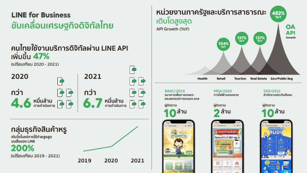 ในปี 2564 ที่ผ่านมา ประเทศไทยมีการเติบโตในเศรษฐกิจดิจิทัลเป็นอย่างมาก ดัชนีชี้วัดของการใช้งานบริการดิจิทัลผ่าน LINE API ที่เติบโตขึ้นถึง 47% จาก 4.6 หมื่นล้านการดำเนินการในปี 2563 สู่ 6.9 หมื่นล้านการดำเนินการในปี 2564 สะท้อนให้เห็นถึงภาคธุรกิจที่ปรับตัวเข้าสู่ดิจิทัลโดยมี LINE เป็นแพลตฟอร์มสำคัญในการขับเคลื่อน