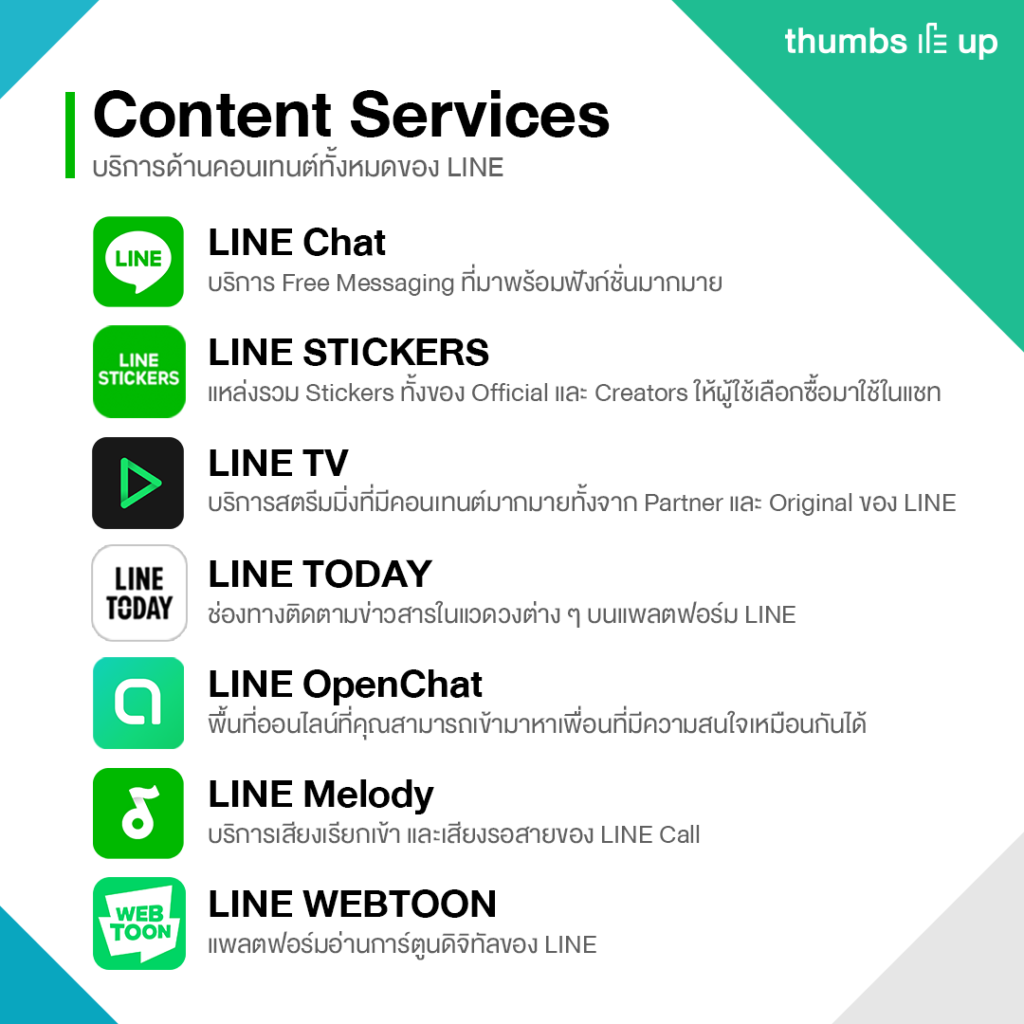 วันนี้ทีมงาน thumbsup จึงได้รวบรวมรายชื่อบริการทั้งหมดของ LINE ประเทศไทยมารวมกันเป็นภาพชุดสรุปแบบง่าย ๆ ให้ผู้อ่านทุกท่านได้เข้าใจบริการประเภทต่าง ๆ ของ LINE ประเทศไทยกันครับ