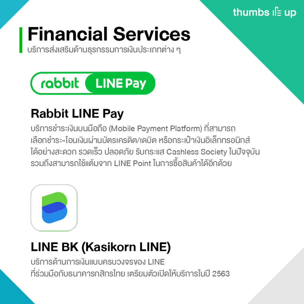 - Rabbit LINE Pay บริการชำระเงินบนมือถือ (Mobile Payment Platform) สามารถเลือกชำระ-โอนเงินผ่านบัตรเครดิต/เดบิตหรือกระเป๋าเงินอิเล็กทรอนิกส์ (E-wallet) ได้อย่างสะดวก รวดเร็ว ปลอดภัย รับกระแส Cashless Society ในปัจจุบัน รวมถึงสามารถใช้ LINE Points เป็นส่วนลดในการซื้อสินค้าได้อีกด้วย