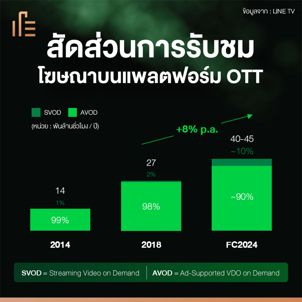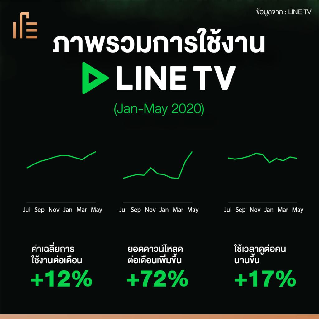 เห็นได้ชัดจาก LINE TV ที่มียอดดาวน์โหลดเพิ่มขึ้น 43% และใช้เวลาดูนานขึ้นรวม 43% ด้วยเช่นกัน ขณะที่ด้านผู้ผลิตคอนเทนต์ในประเทศนั้นก็จะถูกดึงฐานผู้ชมโดยแพลตฟอร์มออนไลน์ระดับโลก ซึ่งมีโปรดักชั่นคอนเทนต์ขนาดใหญ่เช่นเดียวกัน จากปัจจัยเหล่านี้ LINE TV จึงเล็งเห็นว่าเป็นทั้งตัวกระตุ้นและโอกาสสำหรับผู้ผลิตคอนเทนต์ในประเทศและเหล่าแบรนด์ต่างๆที่จะให้ความสำคัญกับแพลตฟอร์ม OTT TV โดยเฉพาะประเภท AVOD ที่กำลังจะมีบทบาทเป็นอย่างมากในตลาดคอนเทนต์ไทย”