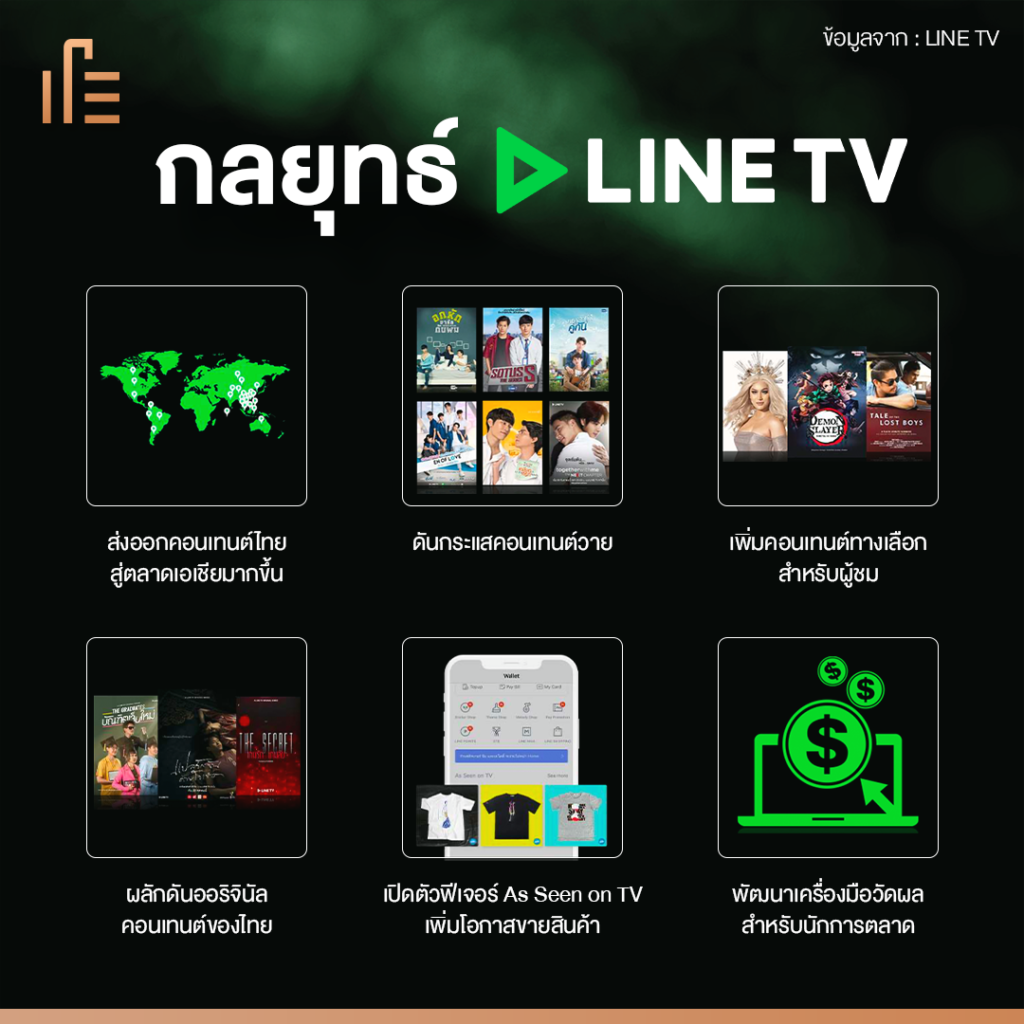 LINE TV ซึ่งเป็นแพลตฟอร์ม AVOD จึงได้ชู 6 ปรากฏการณ์กลยุทธ์ ตลอด 6 ปีที่ผ่านมา เพื่อตอกย้ำทิศทางในการเป็นผู้นำแพลตฟอร์มในตลาด OTT TV เมืองไทย ดังนี้