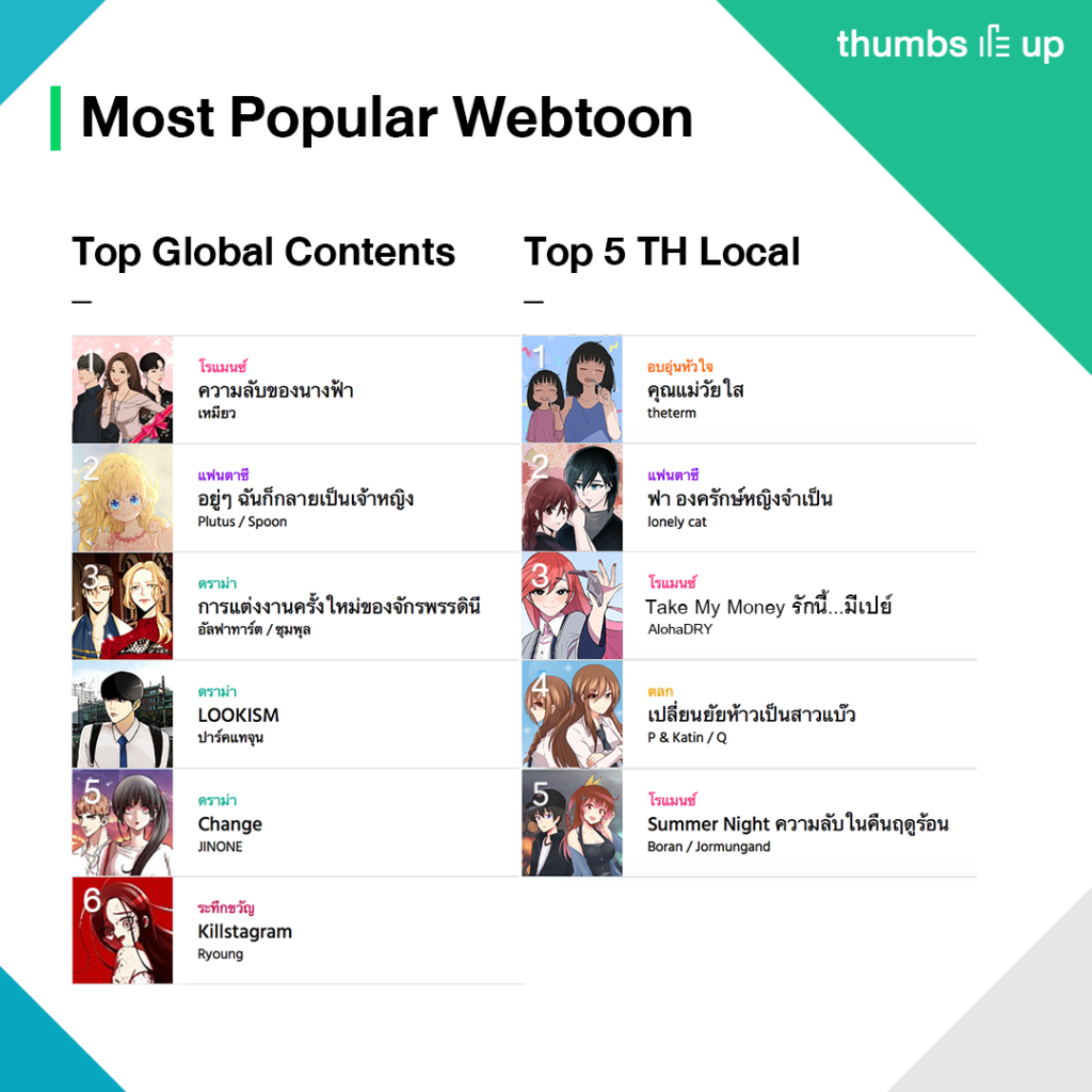 นอกจากนี้ ครีเอเตอร์ชาวไทยเรียกว่ามีฝีมือและโอกาสในการเติบโตอย่างมาก จนเรียกได้ว่าเป็น HUB ของนักอ่านภูมิภาคนี้ได้เลย แม้ว่าผู้อ่านคอนเทนต์การ์ตูนชาวไทยจะเติบโตถึง 16 ล้านราย แต่ก็เชื่อว่าในอนาคตมีการเติบโตได้มากขึ้นเรื่อยๆ