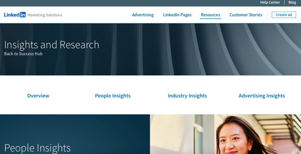 ด้วยข้อมูลมากมายที่ LinkedIn รู้ว่ามีค่าในสายตานักการตลาด LinkedIn จึงเปิดหน้าเพจใหม่ชื่อ LinkedIn Insights and Research ซึ่งจะเป็นฟีเจอร์ใหม่ภายในเครื่องมือชื่อ Success Hub for Marketers ที่เน้นให้บริการในฐานะศูนย์กลางความสำเร็จสำหรับนักการตลาด