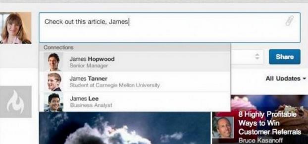 เพื่อแก้ปัญหานี้ LinkedIn จึงประกาศเปิดตัวคุณสมบัติใหม่เมื่อวันพฤหัสบดีที่ 4 เมษายนที่ผ่านมา คุณสมบัติดังกล่าวเป็นความสามารถในการระบุชื่อหรือ mention สไตล์เดียวกับที่ Facebook และ Twitter มีใช้งานอยู่แล้ว นั่นคือการติดชื่อผู้ใช้ลงในบทสนทนาเพื่อให้ผู้ใช้รายนั้นรับรู้เนื้อหาเกี่ยวกับบทสนทนานั้น แต่จะมีจุดต่างคือผู้ใช้จะสามารถระบุชื่อผู้ใช้ LinkedIn รายอื่นในบทสนทนาได้ก็ต่อเมื่อเคยมีการติดต่อด้วยแล้ว หรือผู้ใช้ LinkedIn รายนั้นเป็นส่วนหนึ่งของกลุ่มที่ตั้งขึ้นบนโฮมเพจของ LinkedIn