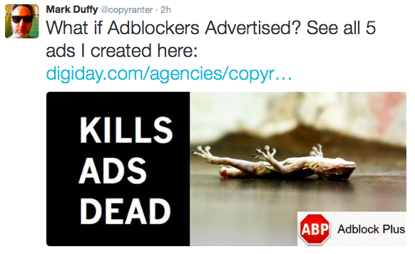Mark Duffy ผู้เขียนเว็บล็อก Copyranter มานานกว่า 10 ปีและมีดีกรีเป็นก็อบปี้ไรท์เตอร์อิสระมากว่า 20 ปี อาสาทดลองสร้างโฆษณาสำหรับบริการบล็อกโฆษณาเหล่านี้ ซึ่งเป็นงานทดลองที่สามารถสะท้อนจิกกัดความน่ารำคาญของโฆษณาออนไลน์ได้อย่างน่าสนใจ