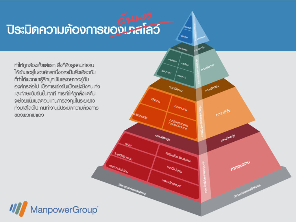 ดังนั้น การเตรียมพร้อมและวางยุทธศาสตร์ที่ถูกต้องตั้งแต่ต้นจะช่วยเพิ่มผลตอบแทนในการลงทุนระยะยาว และทิ้งปิระมิดของมาสโลว์ไป มาสู่ปิระมิดความต้องการของฉันเอง สำหรับปิระมิด 5 ขั้น มุ่งมั่นสู่ความสำเร็จแบบฉบับคนทำงานที่ทางแมนพาวเวอร์กรุ๊ปจัดทำขึ้น ดังนี้