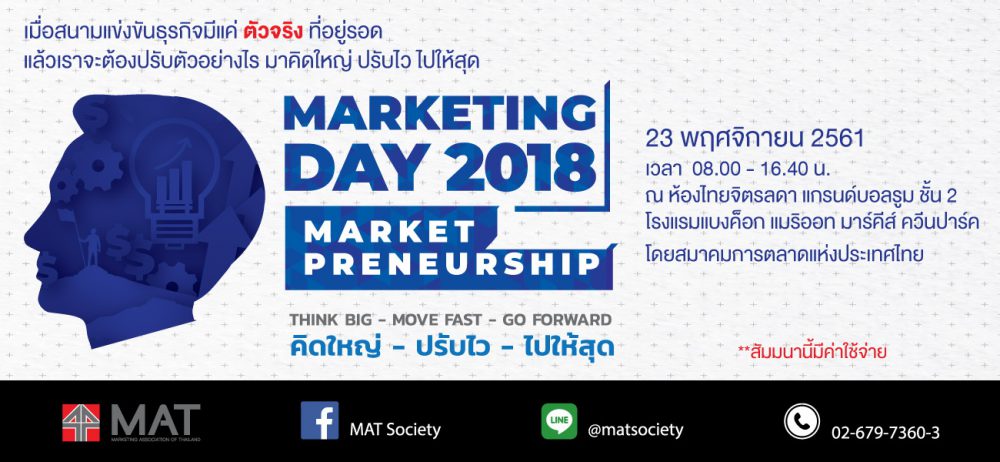 สมาคมการตลาดแห่งประเทศไทย ขอเชิญผู้บริหาร นักธุรกิจ เจ้าของกิจการ นักการตลาด ร่วมอัพเดตเทรนด์ในงานสัมมนา Marketing Day 2018 โดยในปีนี้มีหัวข้อหลักของงาน คือ “Marketpreneurship: Think big – Move fast – Go forward” เพื่อสะท้อนพลังแห่งโลกการตลาดยุคใหม่ที่เชื่อมโยง จุดแข็งของนักการตลาด และหัวใจผู้ประกอบการเข้าด้วยกัน โดยเน้นความสำคัญของ การคิดใหญ่ ความยืดหยุ่นและฉับไว พร้อมใช้หัวใจแห่งความเข้าใจลูกค้าขับเคลื่อนธุรกิจให้ทะยานไปข้างหน้า เพื่อเสริมความแข็งแกร่งด้านการตลาดให้แก่องค์กร และยกระดับการตลาดชาติไทยให้ทัดเทียมนานาประเทศ