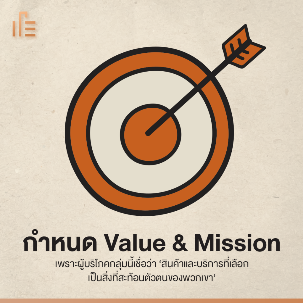 คุณค่าของแบรนด์อาจจะเป็นสินค้าที่เชื่อว่าทำให้คนมีความสุขขึ้น ลดความเหลื่อมล้ำในสังคม หรือเพิ่มความเท่าเทียมทางเพศ ดังนั้นภารกิจที่กำหนดว่าแบรนด์ของเรายืดหยัดเพื่อสิ่งไหน เรื่องใด จะช่วยเชื่อมต่อกับผู้บริโภคกลุ่มนี้