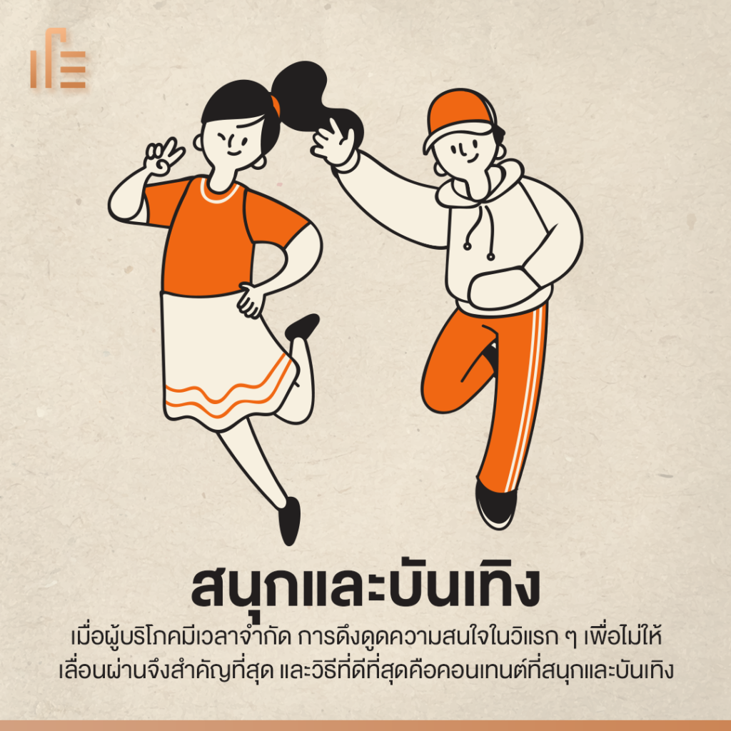 สิ่งสำคัญในการทำแบรนด์คอนเทนต์คือผู้บริโภคมีเวลาจำกัด การดึงดูดความสนใจในวิแรกๆ เพื่อไม่ให้เลื่อนผ่านจึงสำคัญที่สุด และวิธีที่ดีที่สุดคือคอนเทนต์ที่สนุกและบันเทิง