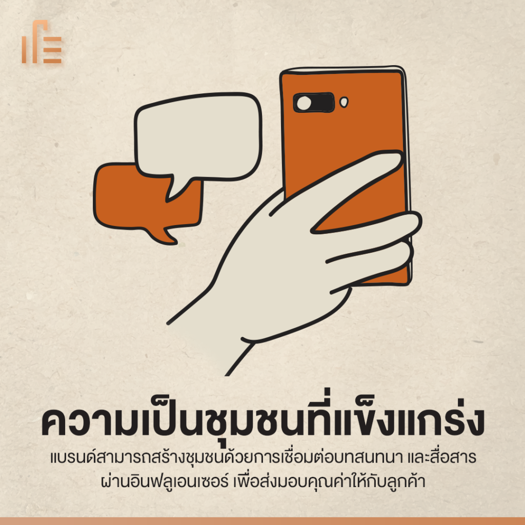 แบรนด์สามารถสร้างชุมชนด้วยการเชื่อมต่อบทสนทนา และสื่อสารผ่านอินฟลูเอนเซอร์ เพื่อส่งมอบคุณค่าให้กับลูกค้า ทำให้เกิดความจงรักภักดีต่อแบรนด์มากยิ่งขึ้น