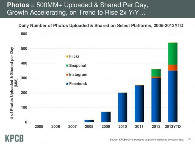 Meeker ได้ชี้ให้เห็นว่าจำนวนตัวเลขนี้จะเพิ่มขึ้นเป็น 2 เท่าภายในปีหน้า และเครือข่ายสังคมที่มีอัตราการเติบโตของจำนวนรูปที่แชร์มากที่สุดก็คือ Snapchat ที่เปิดให้ผู้ใช้แชร์รูปต่างๆ โดยรูปเหล่านั้นจะแสดงในระยะเวลาสั้นๆ และจะถูกลบทิ้งไปโดยอัตโนมัติ