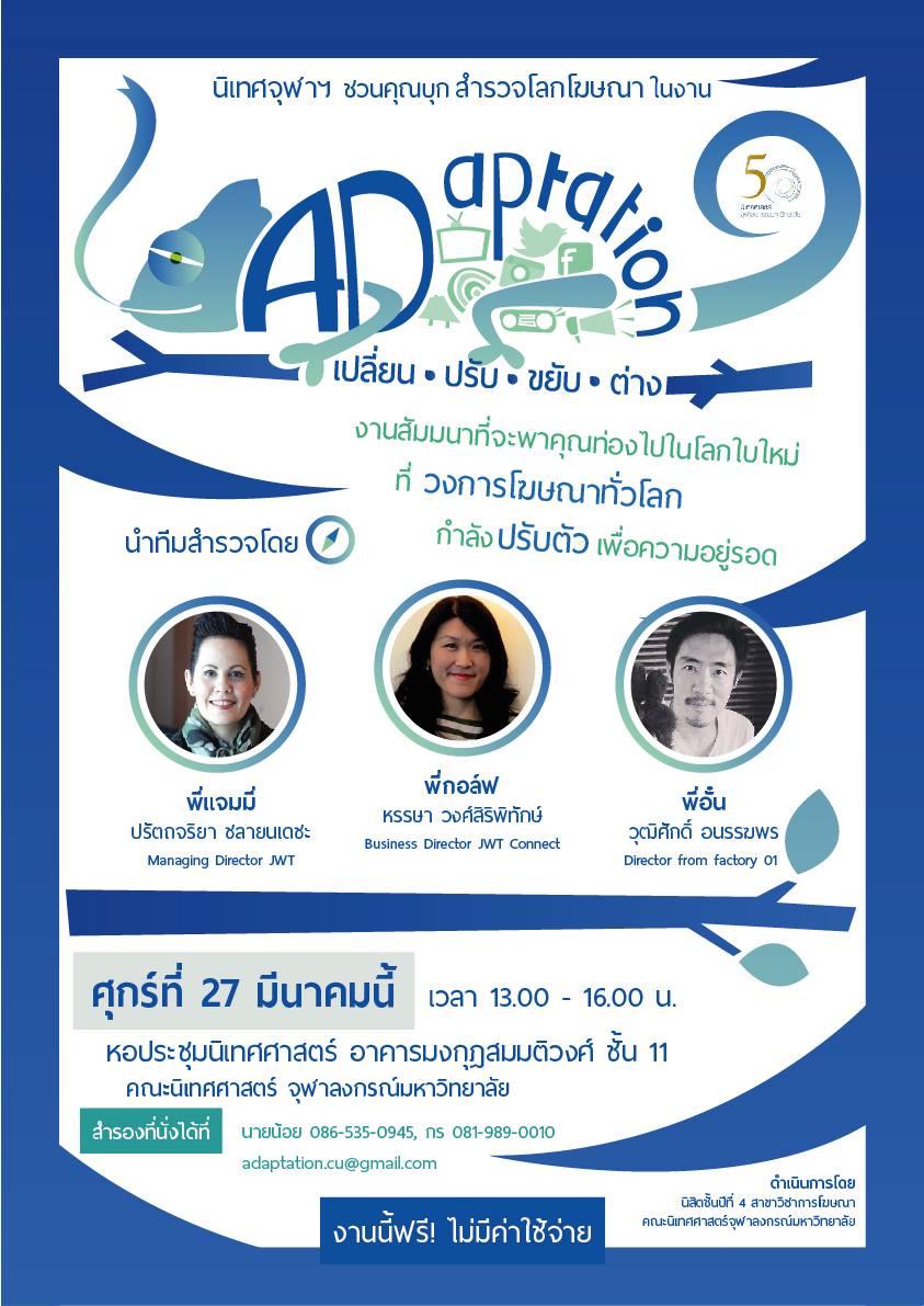 สาขาวิชาการโฆษณา คณะนิเทศศาสตร์ จุฬาลงกรณ์มหาวิทยาลัย จะจัดงานสัมมนา “ADaptation เปลี่ยน•ปรับ•ขยับ•ต่าง” โดยมีวิทยากรจากวงการโฆษณาที่จะมาร่วมแบ่งปันมุมมองและประสบการณ์ดังต่อไปนี้ คุณปรัตถจริยา ชลายนเดชะ Managing Director จาก JWT คุณหรรษา วงศ์สิริพิทักษ์ Business Director จาก JWT Connect คุณวุฒิศักดิ์ อนรรฆพร ผู้กำกับโฆษณา จากบริษัท factory 01