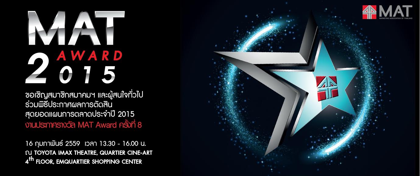 สมาคมการตลาดแห่งประเทศไทย ขอเชิญนักการตลาดและผู้สนใจ ร่วมลุ้นว่าแคมเปญการตลาดใดจะคว้ารางวัลสุดยอดแคมเปญการตลาดแห่งปี MAT Award 2015” พร้อมฟังการเสวนาและนำเสนอผลงานจากเจ้าของแคมเปญที่ได้รับรางวัล Gold Award แบบเจาะลึก