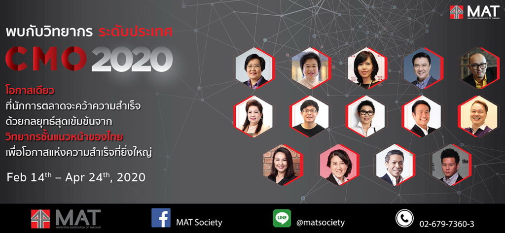 ลงทะเบียนด่วน.. รับเพียง 30 ท่านเท่านั้น พบกัน 14 ก.พ.– 24 เม.ย. 2020 (ทุกวันศุกร์) ณ โรงแรม เรเนซองส์ ราชประสงค์,โรงแรมสยามเคมปินสกี้ กรุงเทพและโรงแรมวีรันดา รีสอร์ท แอนด์ สปา หัวหิน สอบถามรายละเอียดที่สมาคมการตลาดแห่งประเทศไทย **หลักสูตรนี้มีค่าใช้จ่าย Tel : 0-2679-7360-3 Line id : @matsociety