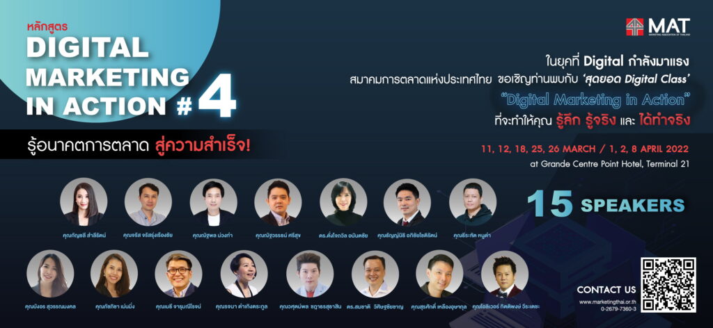 สมาคมการตลาดแห่งประเทศไทย ขอเชิญท่านพบกับคอร์ส “Digital Marketing In Action รุ่นที่ 4” หนึ่งเดียวที่จะให้ท่านผู้บริหารได้ reskill และ upskill ความรู้เกี่ยวกับการตลาดในโลกยุคดิจิทัลแบบเจาะลึก 8 วัน 8 หัวข้อ กับ 15 ผู้เชี่ยวชาญในสายงานดิจิทัล ในวันที่ 11 มีนาคม – 8 เมษายน 2565 เวลา 09.00 – 16.00 น. ณ โรงแรมแกรนด์เซ็นเตอร์พอยท์ เทอมินอล 21