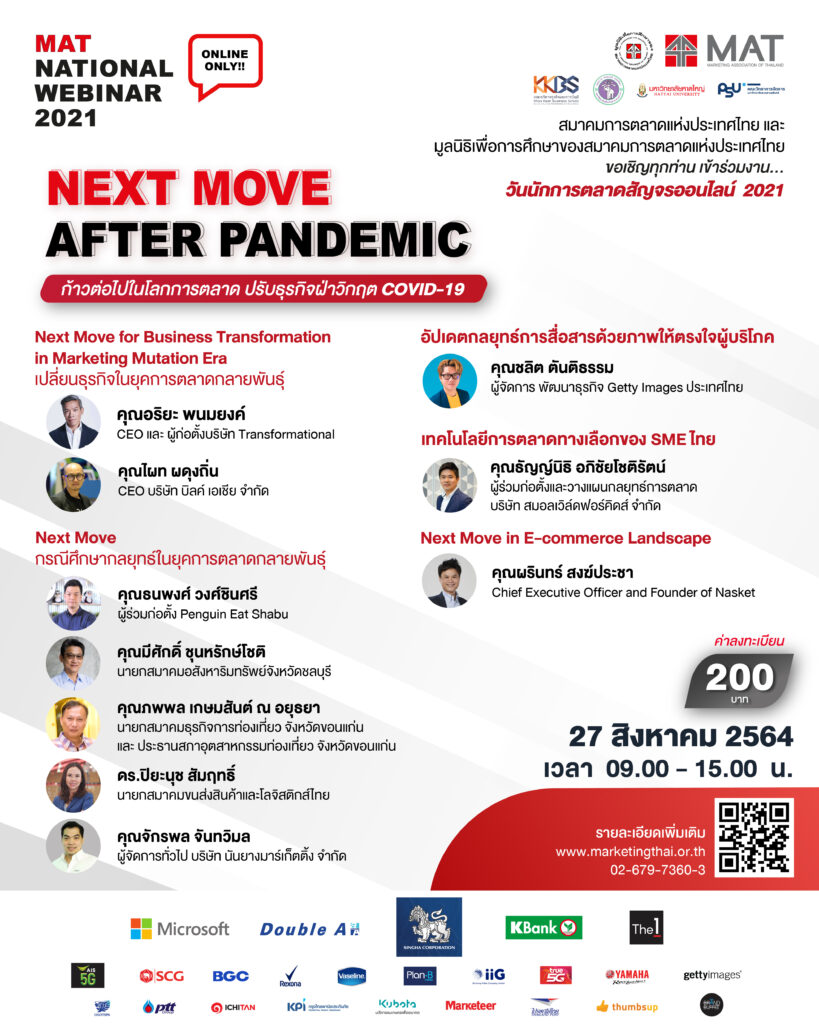 จากสถานการณ์โควิด-19 ระลอกใหม่ ภาคธุรกิจต้องปรับตัวเป็นอย่างมากเพื่อการอยู่รอด สมาคมการตลาดแห่งประเทศไทย จึงผนึกกำลังกับภาคีการศึกษาทั่วประเทศ นำโดย มหาวิทยาลัย ขอนแก่น มหาวิทยาลัยเชียงใหม่ มหาวิทยาลัยสงขลานครินทร์ และมหาวิทยาลัยหาดใหญ่ ร่วมจัดงาน “MAT National Webinar 2021 : Next Move After Pandemic” งานสัมมนาการตลาดในรูปแบบออนไลน์ครั้งยิ่งใหญ่ ในวันศุกร์ที่ 27 สิงหาคมนี้ เพื่อร่วมกันชี้ทางออกของโลกการตลาดหลังยุควิกฤติโควิด-19