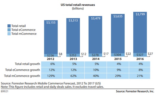 อย่างไรก็ตาม ผู้ค้าปลีกรายใหญ่ส่วนใหญ่ในสหรัฐฯกลับมียอดขายจาก Mobile commerce เพียง 1.5% ของยอดขายจากช่องทางออนไลน์ ซึ่ง Forrester มองว่ารายได้จากส่วนนี้ จะมีโอกาสเพิ่มขึ้นอีก 33% หรือคิดเป็นเงินประมาณ 31,000 ล้านเหรียญ ซึ่งจะดันให้ยอดขายจากช่องทางออนไลน์เพิ่มขึ้นเป็น 9% ภายในปี 2017