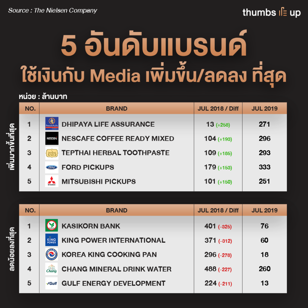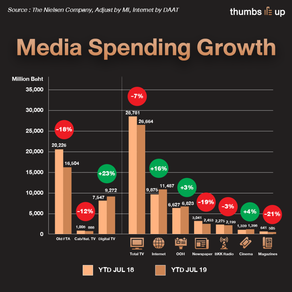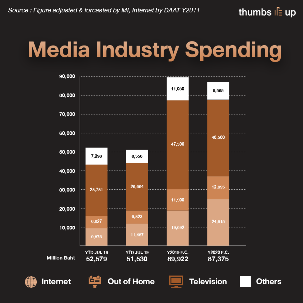 แม้จากกราฟจะเห็นว่าสื่อทีวีดิจิทัล สื่ออินเทอร์เน็ต และสื่อนอกบ้าน ยังมีทิศทางเป็นบวก แต่สื่ออื่นๆ ต่างก็ทะยอยติดลบกันมาติดๆ การที่ 3 สื่อหลักมีทิศทางที่ดีแต่ก็ไม่ใช่เงินที่หมุนเวียนในประเทศทั้งหมด เช่น สื่ออินเทอร์เน็ตคนก็เน้นไปที่การบูสต์โพสต์บนโซเชียลมีเดีย อย่าง Facebook LINE Twitter Youtube Instagram แต่กลับไม่เลือกลงในสื่อออนไลน์ที่มีเว็บไซต์น่าเชื่อถือ อย่าง Sanook Pantip หรือ thumbsup เองก็ตาม ทั้งที่สื่อออนไลน์เหล่านี้เป็นคนนำเสนอข้อมูลข่าวสารของแบรนด์ แต่ก็เลือกเน้น Reach เพื่อให้คนจดจำแบรนด์